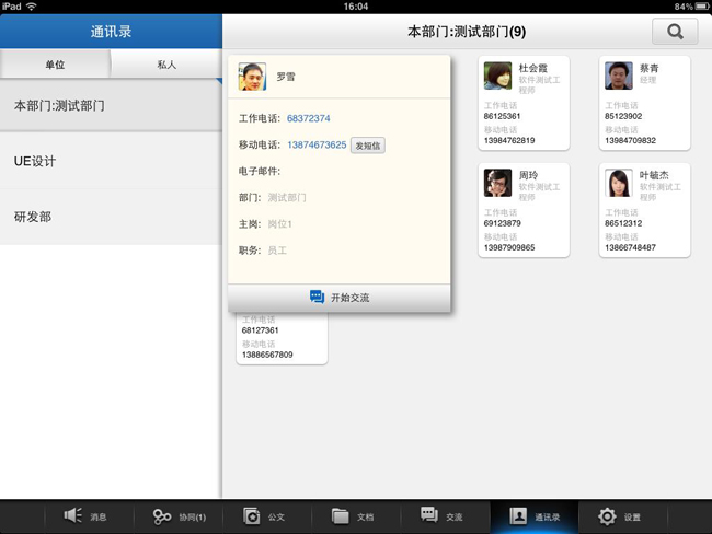 同事联系信息一查便知, 点击头像就可直接打电话、发短信、发邮件、发起即时交流。