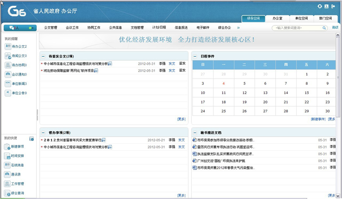 通过统一的用户界面把系统中各个模块的信息科学的、有机的展现出来,方便用户第一时间了解自己待办、待阅的各种公文、会议、通知、公告、新闻等。