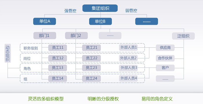 通过在全面的组织协同管理、聚焦的协同应用主题、增强的业务管理之外增加多组织管理引擎来实现集团管控的应用价值,包括强管控和弱管控的模式,实现运营导向、战略导向和财务导向三种管控模式。