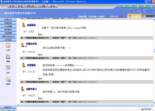 而OA上线之后,为劲草公司的企业文化建设带来了很大改观。A6首先是一个聚合平台,每天工作,员工就会登录其中,而且新发布的帖子会有提示,自然就会吸引大家去点击、去发言,这是之前的手段所无法比拟的。其次,全国各地的劲草人都在其中发言,会吸引更多的人,如此一来就形成了良好正向循环,全国各地的员工也会在这里形成一股良好的凝聚力,通过各种帖子,将企业文化传递到销售一线的每一个人心中,极大地提高了公司员工的凝聚力。“我们经常可以看到全国各地劲草的员工为我们取得的成就而叫好、助威,为我们的每一点进步而努力……”说起文化建设,陈燕总是充满着笑容。